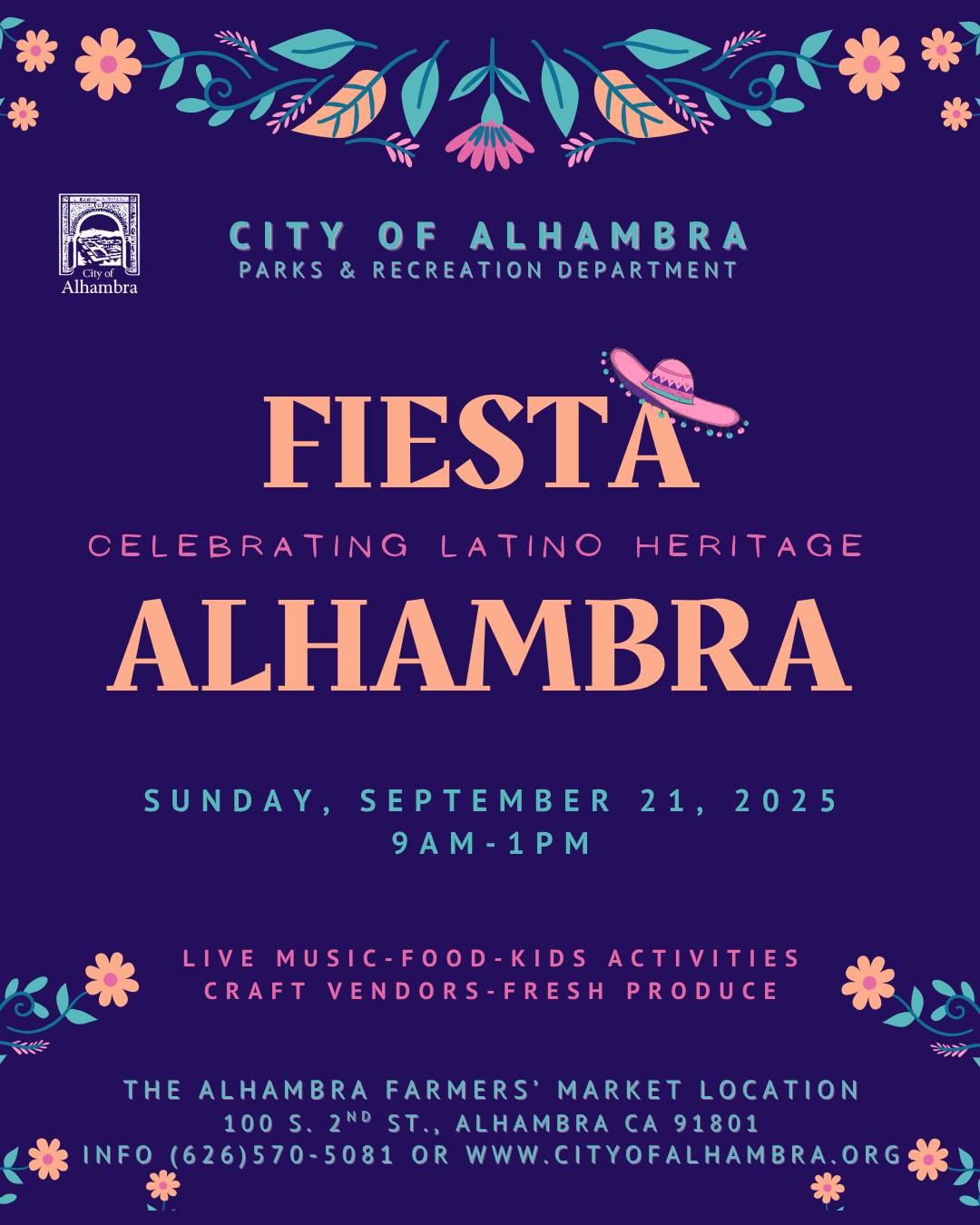 Save the date: Celebrate Latino Heritage Month with the City of Alhambra at Fiesta Alhambra on Sunday, September 17 next to the Certified Farmers Market (100 S. 2nd St)! Starting at 10 AM, come enjoy live music, food, activities and more while you shop at the Farmers Market! For more information, call (626) 570-5081.