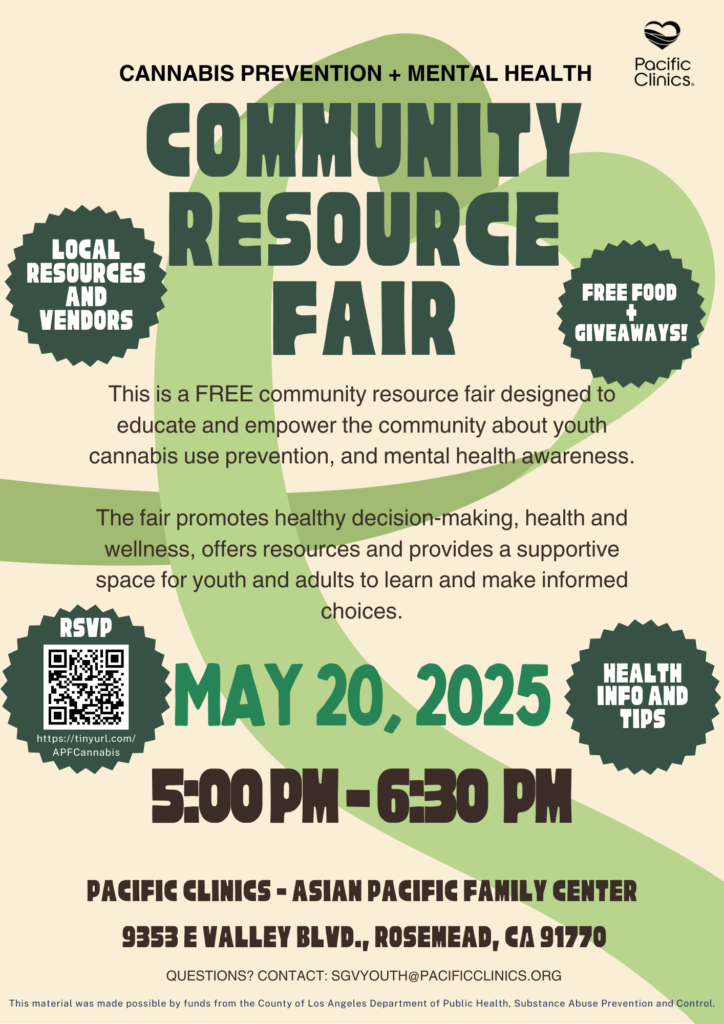Pacific Clinics-APFC is excited to invite you to attend our San Gabriel Valley (SGV) Cannabis Awareness and Mental Health Community Resource Fair – open to all community members (all ages)! Please complete this form to register to attend.