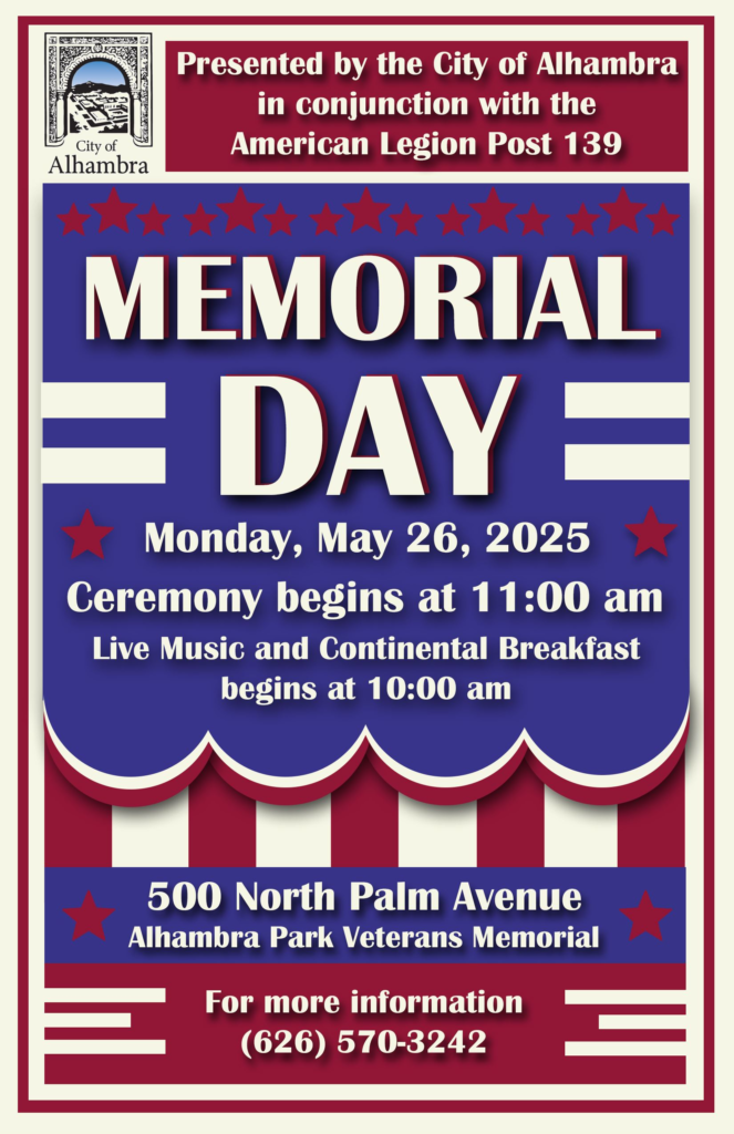 Commemorate Memorial Day with the City of Alhambra and American Legion Post 139 on Monday, May 26 at the Alhambra Park Veterans Memorial (500 N. Palm Ave.).