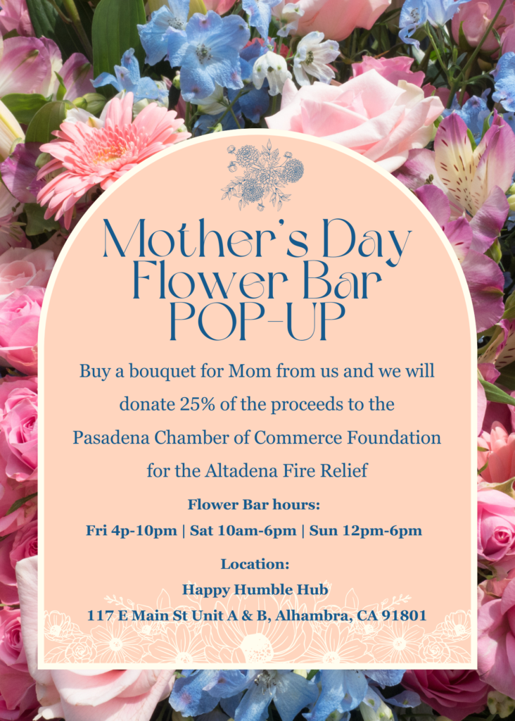 Maravilla Floral Designs is holding a flower bar pop-up at Happy Humble Hub in downtown Alhambra and they will be donating 25% of the proceeds to Pasadena Chamber of Commerce’s Foundation for the Altadena Fire Relief.