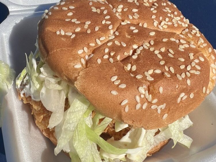 Features a crispy, breaded chicken thigh—marinated for extra flavor and spice—tucked into a soft bun with creamy mayo and crisp iceberg lettuce.