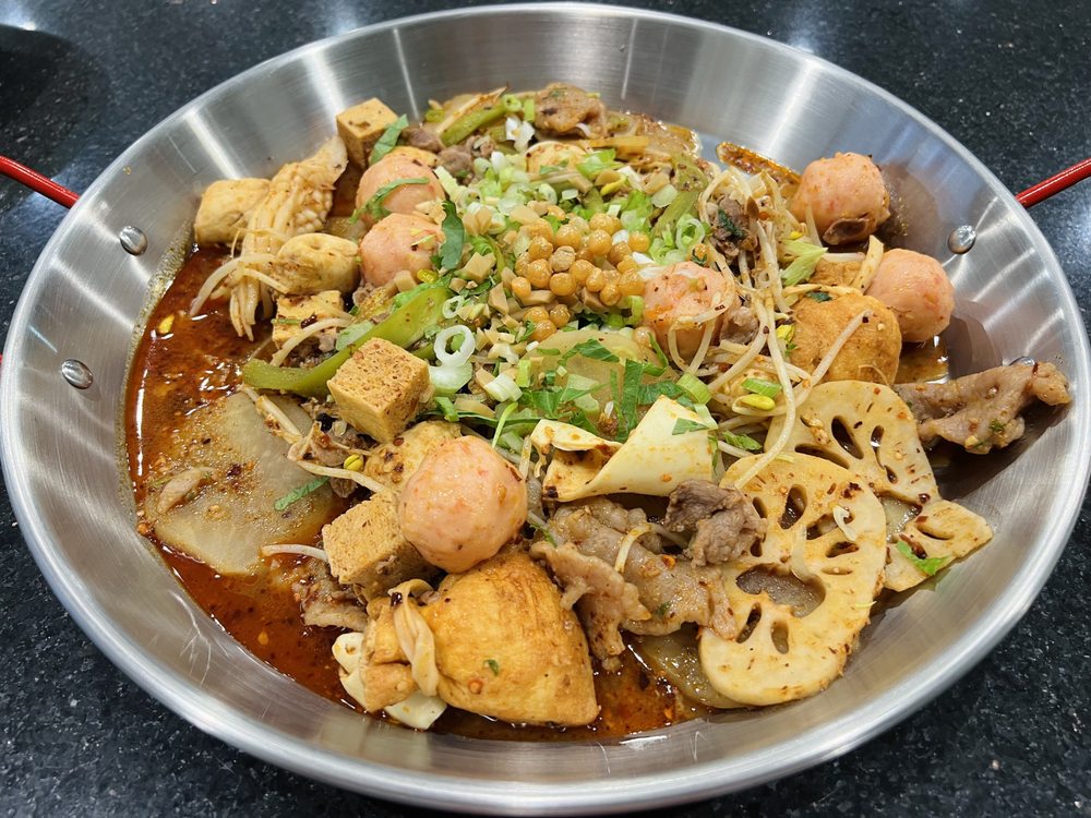 A bold, brothless take on hot pot. Ingredients are stir-mixed in a rich, spicy sauce with chili oil, garlic, and Sichuan peppercorns.
