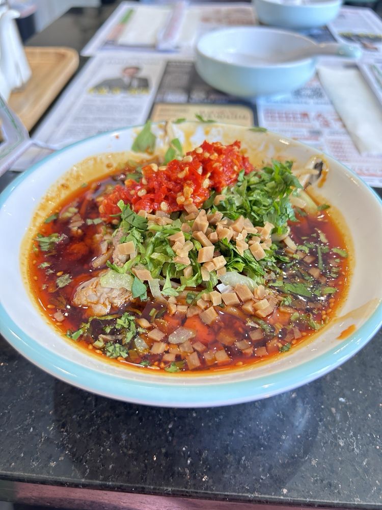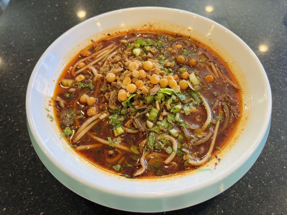 Tangy, spicy dish featuring chewy noodles in a broth flavored with vinegar, chili oil, garlic, and peppercorns.